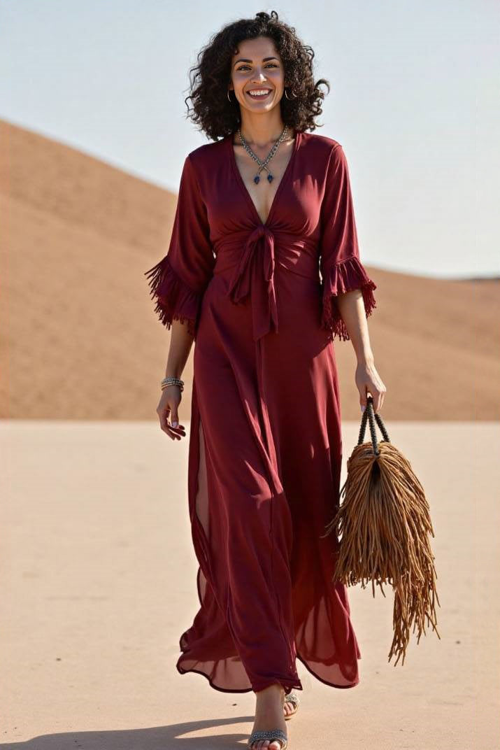 Flow through your vacation days in this deep red maxi dress featuring a V-neckline and relaxed silhouette. With a lightweight, breezy fabric and a flattering length, it’s an easy piece to dress up with accessories or wear casually for a relaxed boho look.