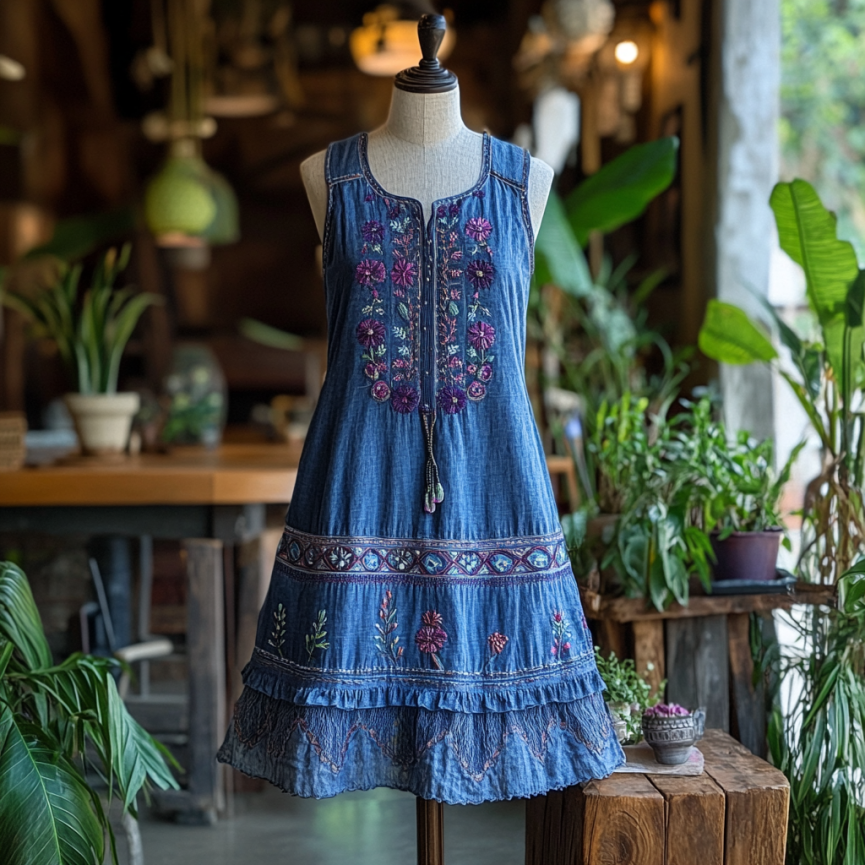 Vintage Bohemian Floral Embroidery Linen Mini Dress