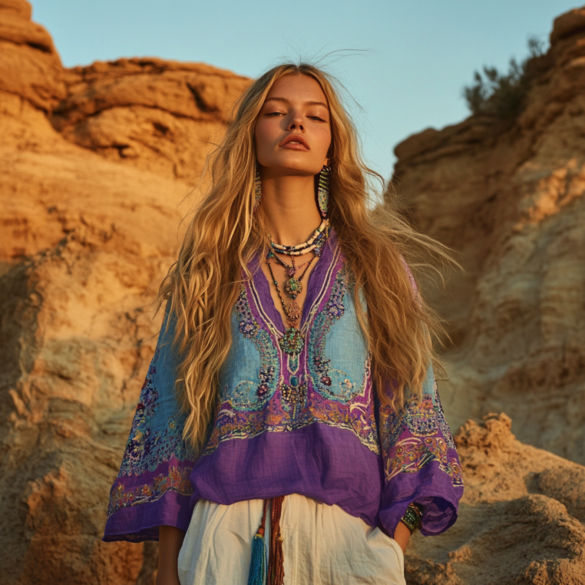 Vintage Boho Bohemian Ethnic Color Block Patchwork Linen V-neck Tunic