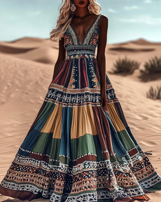 Women's Boho Geometry Art Color Block Sleeveless Maxi Dress